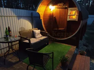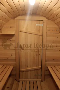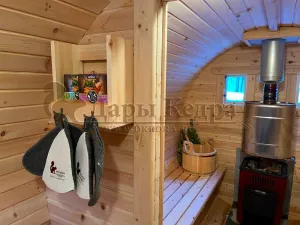 Это изделие круглой вытянутой формы. Козырек не только украшает баню, но и защищает оставленную обувь от дождя. Лавочки из кедра находятся по всей длине бани-бочки с обеих сторон. Печь расположена в парилке около дальней стены. Время растопки такой печи не превышает 30 минут. В зависимости от выбранного размера круглая баня-бочка с козырьком имеет следующую комплектацию: