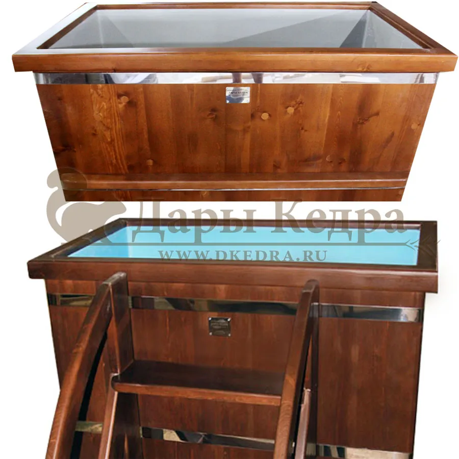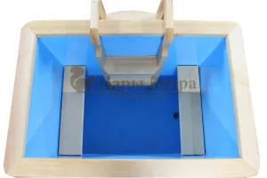 Это емкость для воды с прямоугольной пластиковой чашей. Купель предназначена для отдыха и охлаждения тела после процедур парения. Подходит для уличного и комнатного использования. Для удобства пользования овальная купель с пластиковой вставкой оснащена лавочками, приставной и внутренней лестницей из кедра.